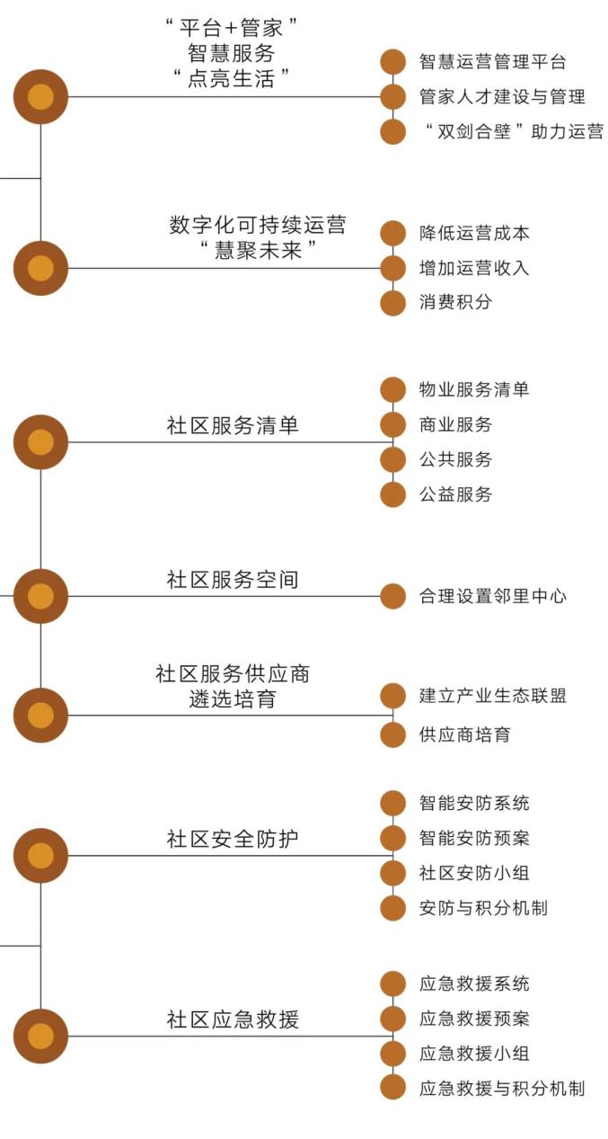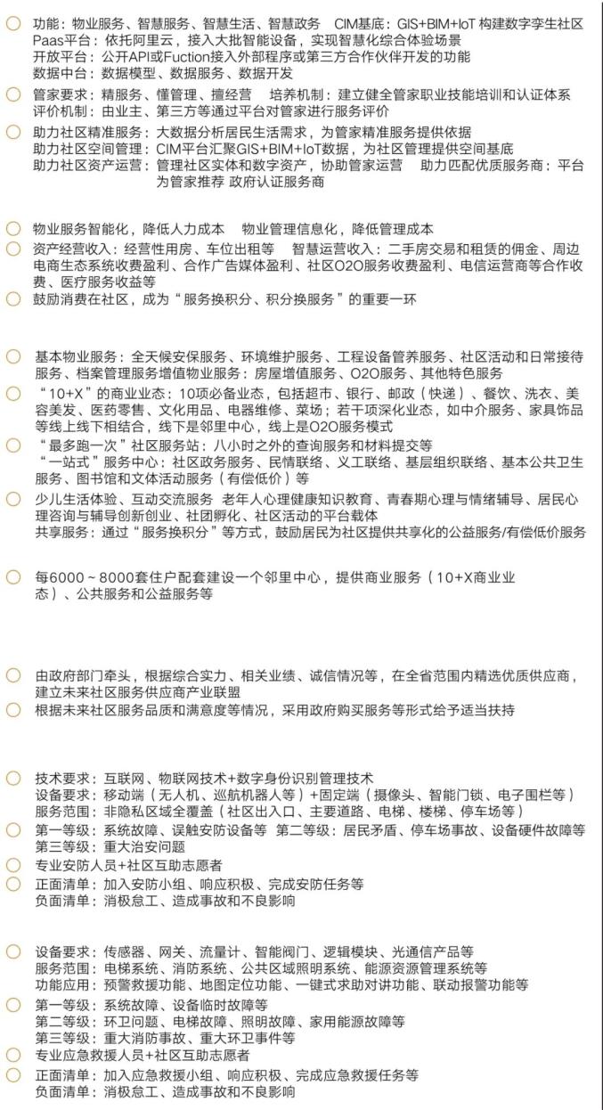 推广“平台+管家”物业服务模式,依托社区智慧平台,按照居民基本物业服务免费和增值服务收费的原则,合理确定供物业经营用房占比,统筹收支平衡。建立便民惠民社区商业服务圈,完善现代供应服务管理,创新社区商业供给和遴选培育机制,以多层次、高性价比为主要标准,精选各类商业和服务配套最优质供应商并在社区推广,结合020模式应用,支持其做大做强,努力催生一批本土品牌。建设无盲区安全防护网,围绕社区治安,构建设界、控格、守点、联户多层防护网,应用人脸识别等技术,推广数字身份识别管理。围绕社区消防和安全生产,应用智能互联技术,实现零延时数字预警和应急救援。