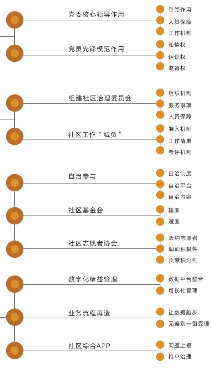 构建党组织统一领导的基层治理体系,完善党建带群建制度,健全民意表达、志愿参与、协商议事等机制,推动党的领导更好嵌入基层治理实践,引领基层各类组织、广大群众积极参与基层治理。采用居民志愿参与的自治方式,构建社区基金会、社区议事会、社区客厅等自治载体和空间,激发多方主体广泛参与社区治理。推行社区闭环管理和贡献积分制,形成社区民情信息库,推举有声望、贡献积分高的居民作为代表共同管理社区事务。搭建数字化精益管理平台,依托浙江政务服务网和“浙政钉”平台,促进“基层治理四平台”的融合优化提升,梳理社区各项任务,强化基层事务统筹管理、流程优化再造、数据智能服务,有效推进基层服务与治理现代化。