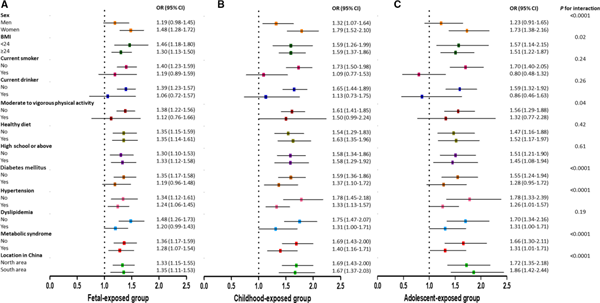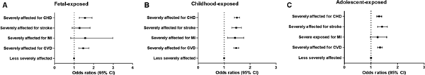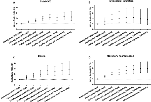 与未暴露组相比,在生命早期暴露于饥荒的人群中,总心血管疾病、心肌梗死、卒中、冠心病的风险均显著增加,各项风险增加的情况在饥荒严重的地区更加明显。在调整了年龄、性别、生活方式、代谢综合征等混杂因素后显示: