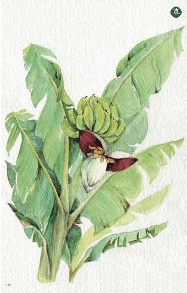 甘蕉,看上去像一棵树,高大的有一围多粗。叶片有一丈或者七八尺长,宽一尺多或二尺多。花朵像酒杯一样大,形状和颜色都像芙蓉花。枝干末端摞着一百多个果实,各成集合,相互连接,味道甜美,也可以用蜜糖腌渍储存。根像是芋头,大的如车轴一般。果实随着花朵生长,每朵花能结一组果实,共六个,相互排列。果实的生长不是同时的,花朵的掉落也有先后。又名芭蕉,或巴苴。把果实的皮剥开,内里的颜色为浅黄或白色,味道像是葡萄,又甜又脆,能充饥。有三种类型:一种果实的大小像拇指,长而尖,像是羊角,名为羊角蕉,味道最甜;一种果实和鸡蛋一样大,又像牛乳,就叫作牛乳蕉,味道微微逊色于羊角蕉;还有一种像藕一样大,果实长六七寸,方形,也不甜,是最下一等。将甘蕉的茎干捣成细丝,加上石灰,可以纺织成葛布,叫作蕉葛。这种葛布虽然硬度高,质量好,不过颜色黄白,不像一般的红色葛布。交广(交州和广州,包括今天的广西、广东两省以及越南的部分地区)一带都有这种植物。《三辅黄图》中记载,汉武帝元鼎六年(公元前111年),打败南越国,建造扶荔宫,用来种植奇花异草,其中就有两株甘蕉。