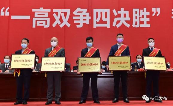 会议通报表彰了年度先进集体、乡村振兴优秀集体和个人,通报了2019年度目标管理综合考评结果、各地各部门获表彰奖励情况。并为红旗单位,突出贡献集体,人居环境整治先进镇、村(社区),年度楷模,十佳村(社区)书记进行了颁奖,为枝江高质量发展做出贡献的企业进行了授牌。会议全面总结2019年工作,安排部署2020年工作。董市镇、马家店街道、市经信商务局、金润源集团公司、三宁公司、奥美公司等11家单位立下夺取“一高双争四决胜”全胜完胜的必胜誓言。