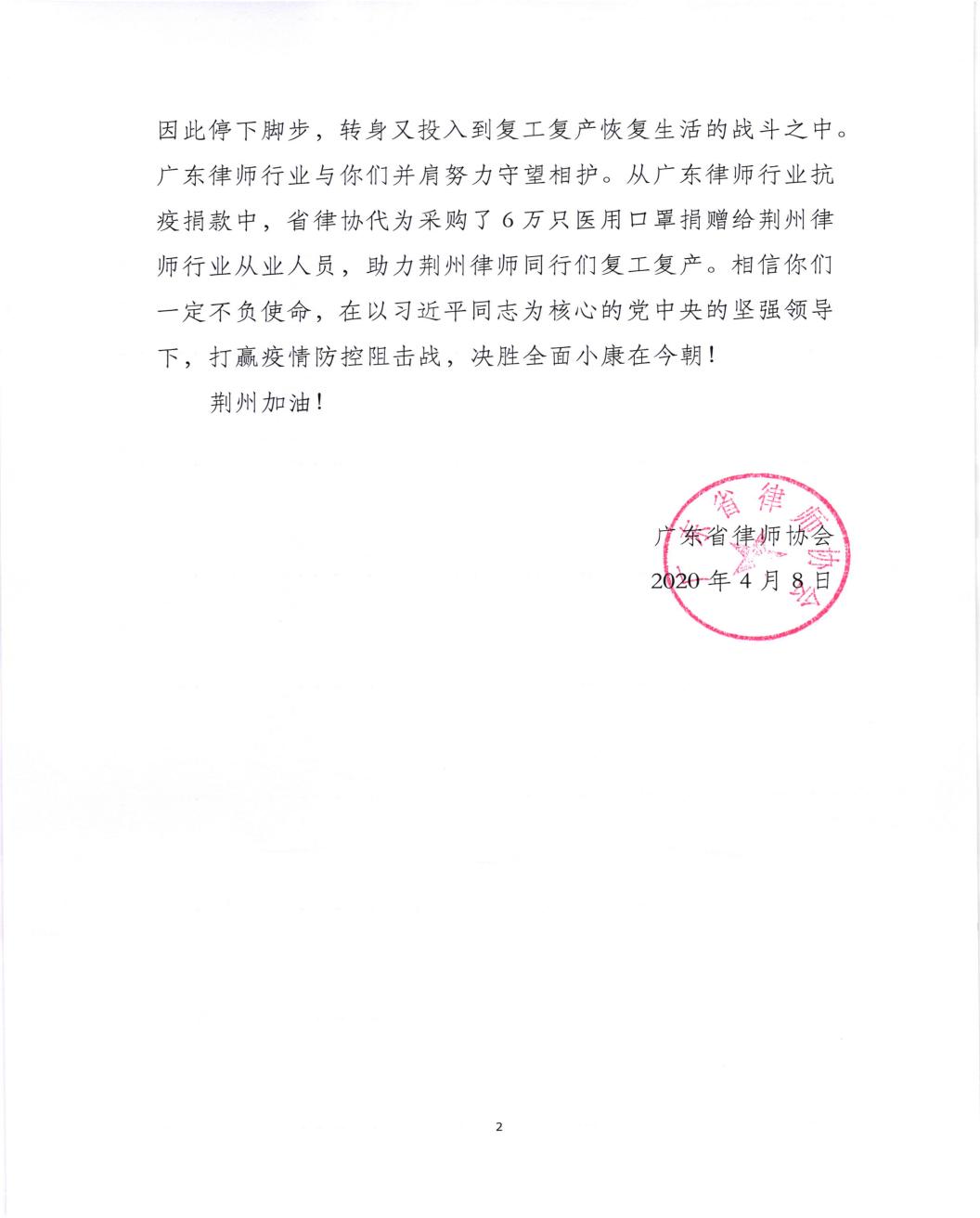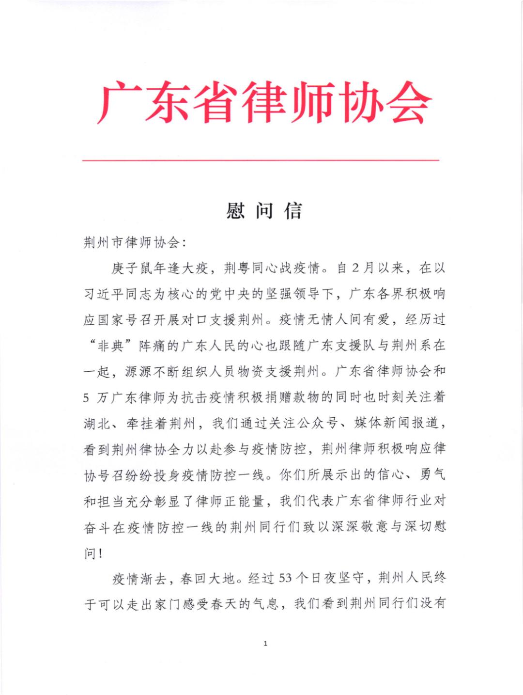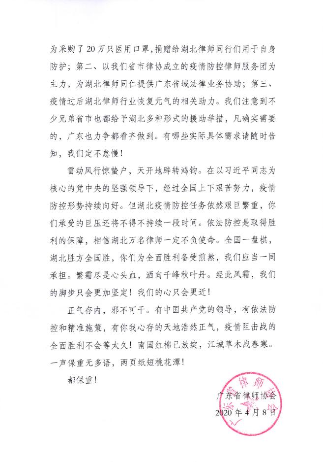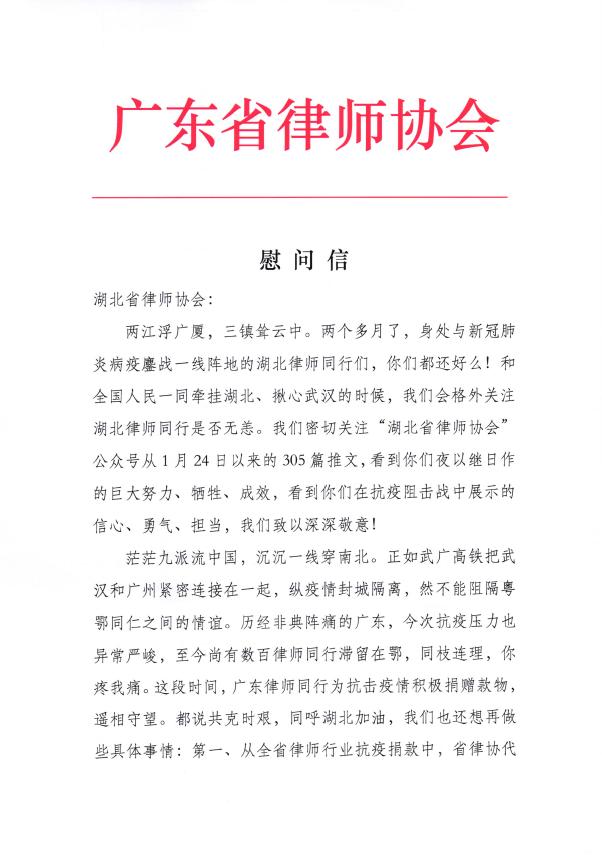 急人之所急必成就友谊,需人之所需定共渡难关,广东省律协愿与湖北省律协一起,以最大的热诚和努力,帮助湖北省律师行业早日走出疫情阴霾,继续为建设法治社会贡献力量。