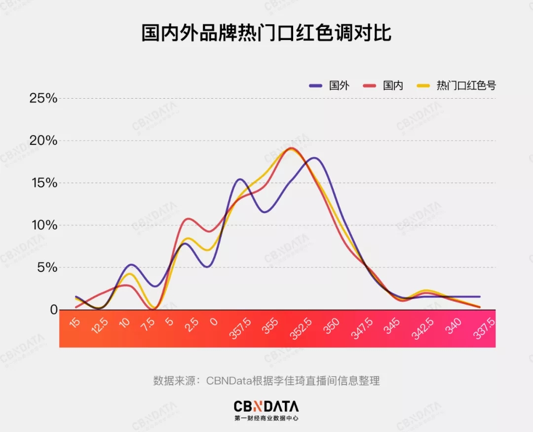 当我们将以爱马仕、香奈儿为代表的国际彩妆品牌以及国货彩妆品牌的热门色号与其对比,能明显看出,国货口红的色调分布与李佳琦的选择更吻合。大数据显示,国货美妆品牌与李佳琦的口红色调相似度高达98.4%。