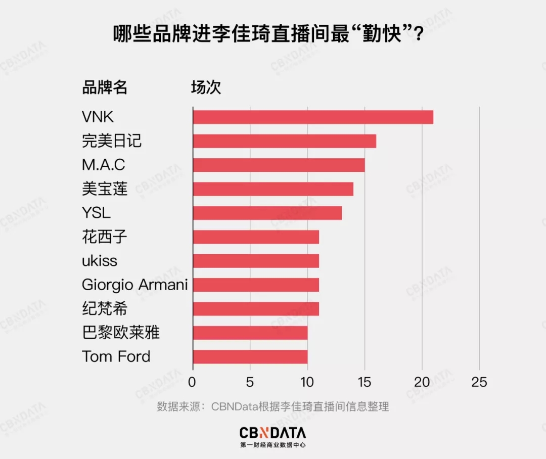 这样的“颜色相投”,也使得国货口红成为了李佳琦直播间的常客。据CBNData统计,在李佳琦直播合作过的美妆品牌中,前两席VNK和完美日记均是国货彩妆品牌。不过,知名国际彩妆品牌M.A.C、美宝莲等也是直播间常客。