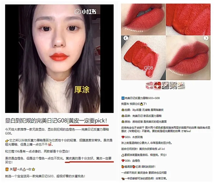 完美日记旗下被李佳琦盛赞能让“白皮用了更白,黄皮用了变白”的G08血橙色号,在小红书收获了大批博主测评认证,纷纷表示“黄皮一定要pick”。而这款颜色,也属于李佳琦最喜爱推荐的橙红色。