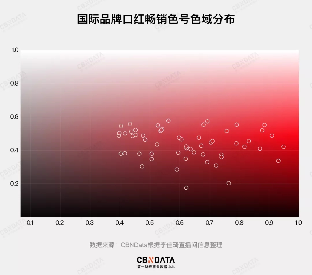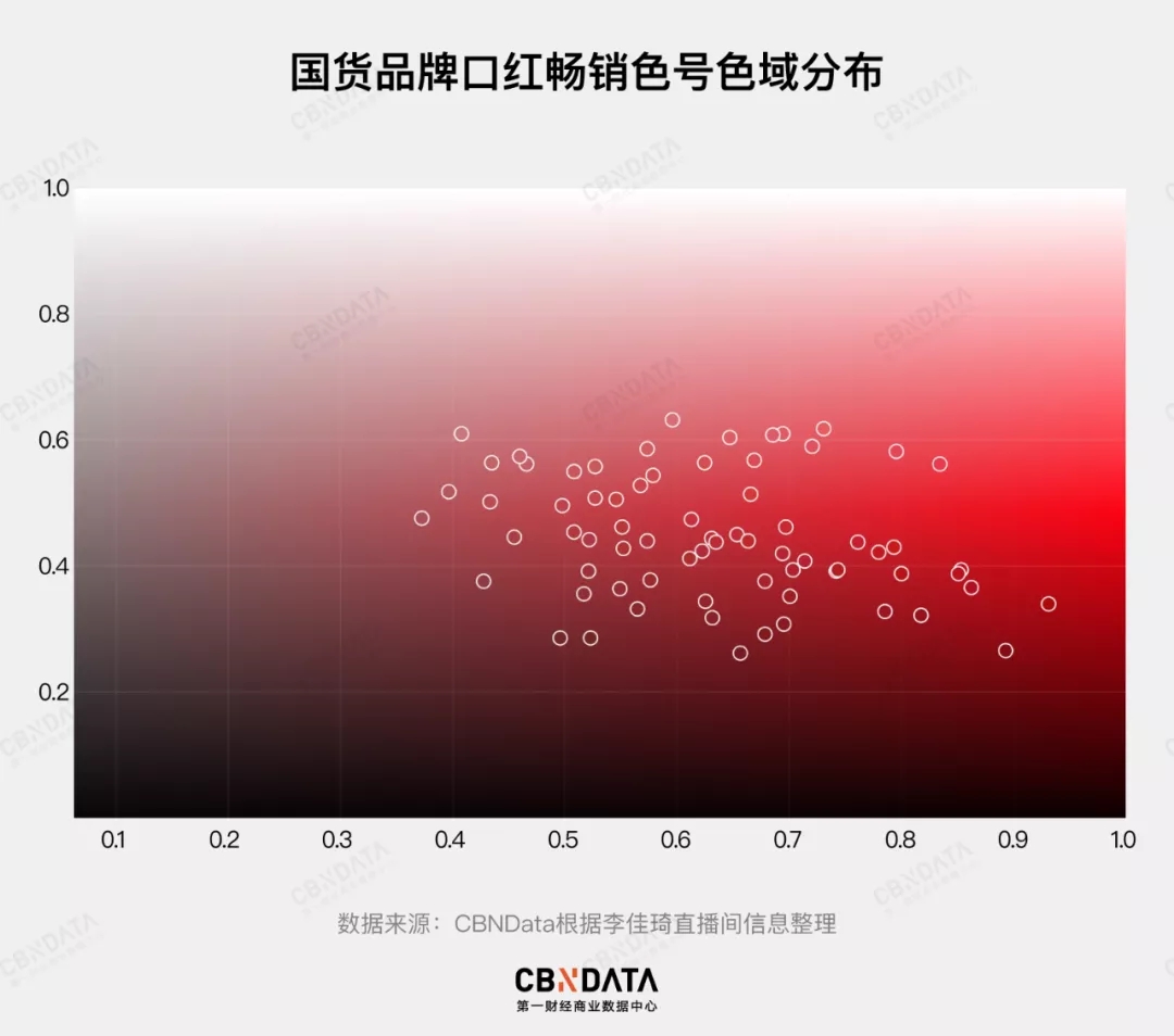 李佳琦和国货彩妆品牌在口红色相(H)上,都表现出了对正红色和橘红色的偏爱。这是因为这些颜色的口红更容易满足中国女性“显白”的诉求。