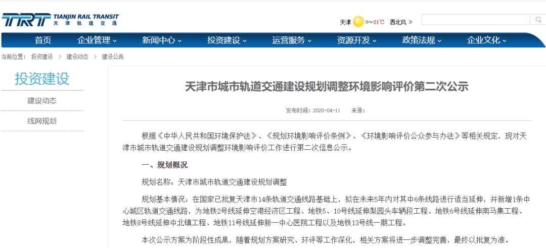 今天(4月11日),天津轨道交通网站发布《天津市城市轨道交通建设规划调整环境影响评价第二次公示》,其中明确了在国家已批复天津市14条轨道交通线路基础上,拟在未来5年内,对其中6条线路进行适当延伸,并新增1条中心城区轨道交通线路。