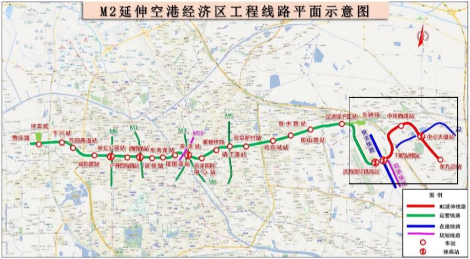 线路走向:M2延伸空港经济区工程线路起于滨海国际机场站,出站后线路向北逐步转入西二道,之后线路转入中心大道,至终点东九道站。