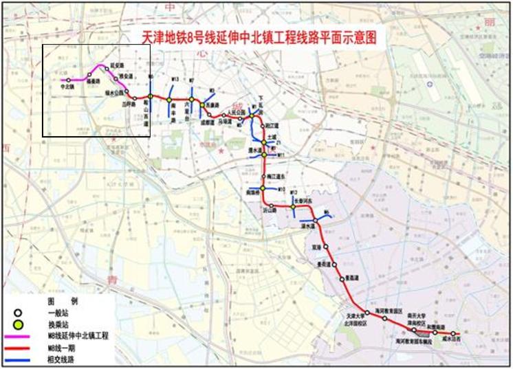 地铁8号线为中心城区南部骨干线,本期延伸工程主要服务中北镇、南开区五金城商贸区等区域,提升环外地区与中心城区的交通衔接。线路长4.82km,设4站,均为地下站。