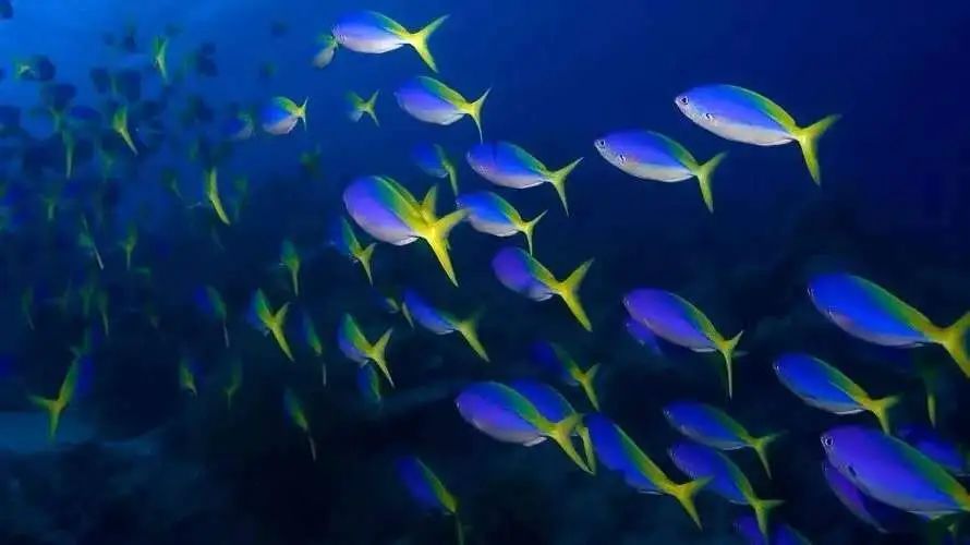 与斑斓游来游去的热带鱼群。