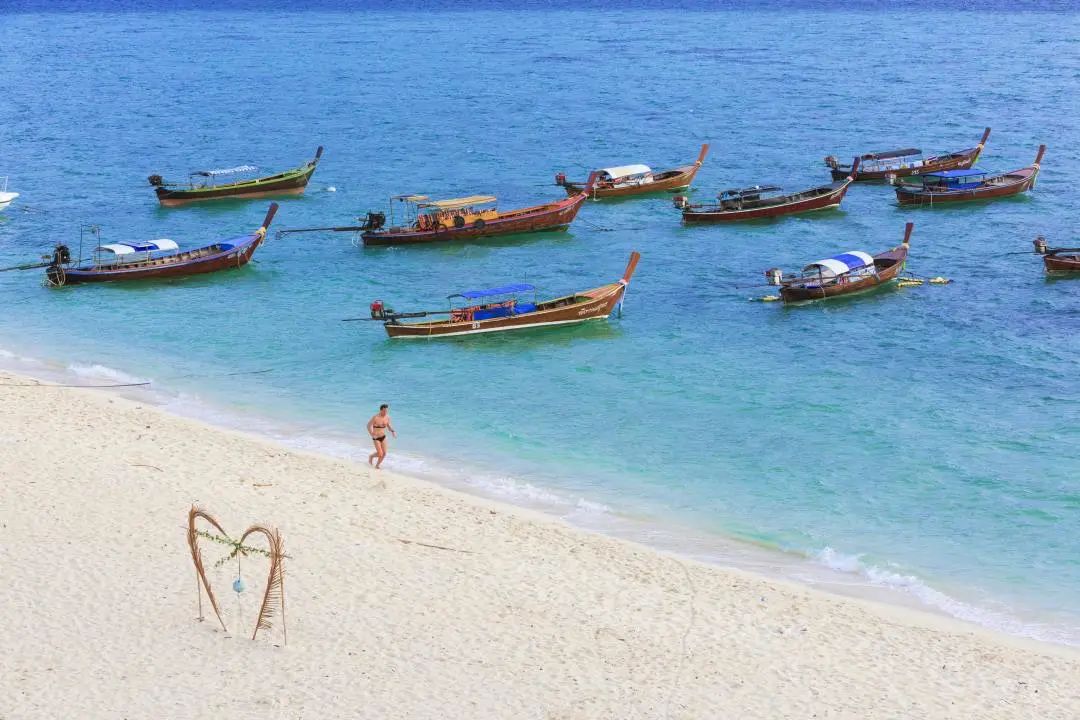在丽贝岛,乘坐长尾船穿梭在岛屿之间游览,