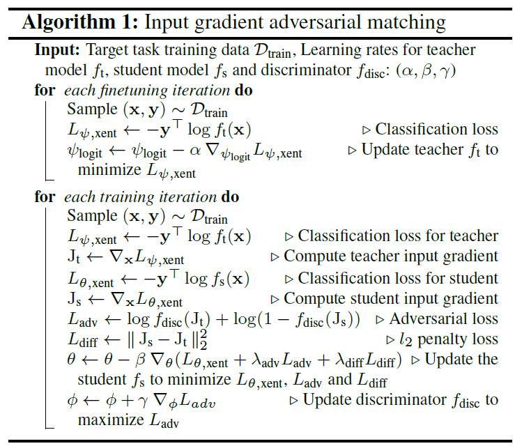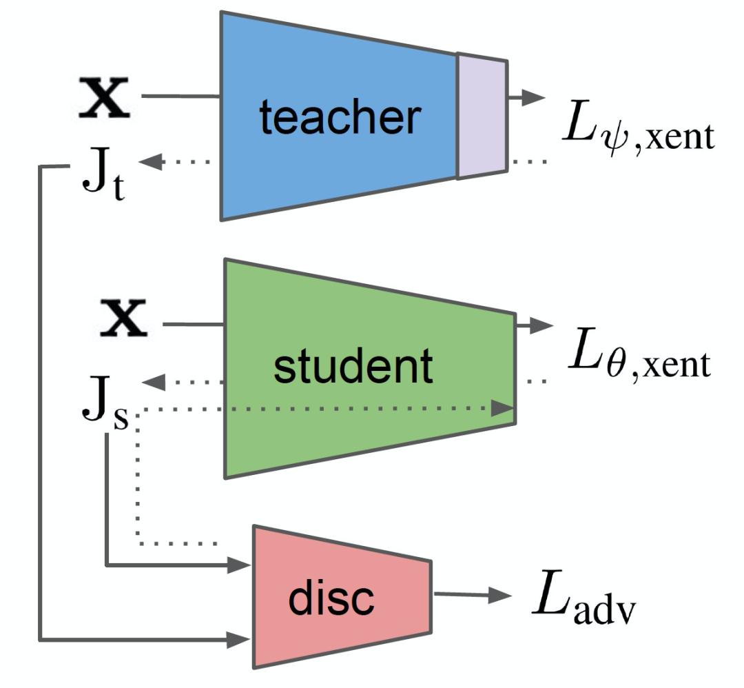 参考 GAN(包含生成器和鉴别器模型的框架)的思想,为了使学生模型的输入梯度与教师模型的输入梯度相似,定义对抗正则化损失函数如下: