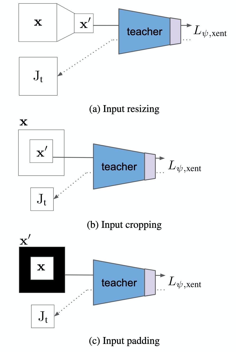 图 3 给出了令图像与教师模型输入维度的匹配转换的三个示例,分别为图像缩放、图像切割和图像填充。