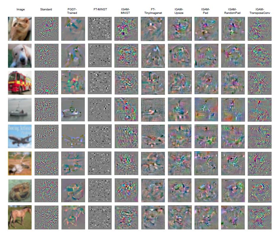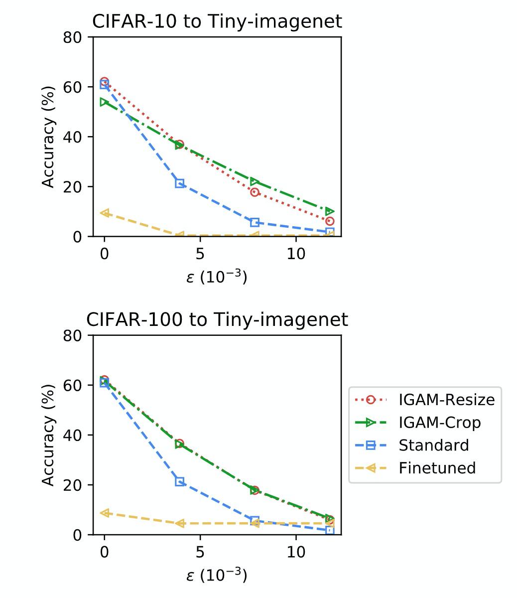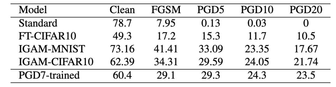 本文在由 MNIST、CIFAR-10、CIFAR-100 和 Tiny-ImageNet 组成的源-目标数据对上完成了 IGAM 实验。图 4 给出了不同数据集中的输入梯度,与标准的模型相比,IGAM 模型的输入梯度噪声较少。表 1、表 2 以及图 5 分别给出了不同数据库中的实验结果,这些结果表明 IGAM 可以在不同的任务之间,甚至在不同的模型结构之间传递鲁棒性。