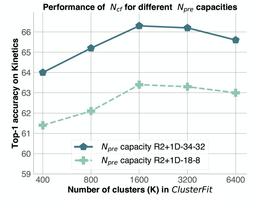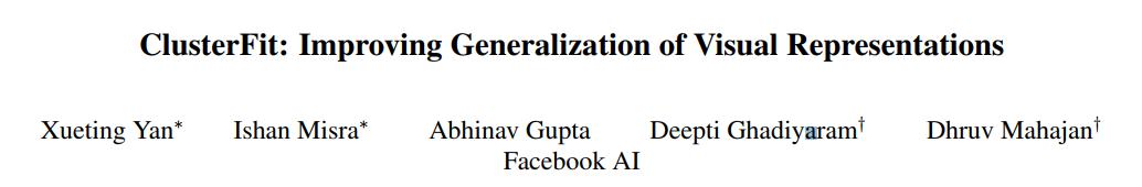 在 11 个公开的、具有挑战性的图像和视频基准数据集上,ClusterFit 显示出显著的性能提升,具体见表 1。ClusterFit(CF)适用于各种不同的预训练方法、模式和结构。