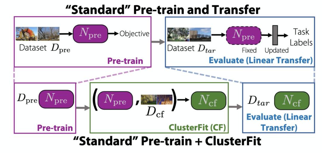通过引入自由标注,弱自监督预训练方法具有良好的适应性。但是,弱自监督预训练方法需要预先逼近一个代理目标函数,以及,假定这个代理目标函数与随后的转移主任务一致,通过优化该代理目标函数就能够生成合适的预先训练的视觉表示。这一假设在充分监督的预训练(fully-supervised pre-training)中基本能够保证成立,但是对于弱自监督学习来说,这很难保证。这篇文章探讨的问题是「有没有一种方法可以解决弱自监督的预训练阶段对代理目标函数过度拟合问题?」作者的思路是:通过对代理目标学习到的特征空间进行平滑处理(smooth)来解决这一问题。本文提出一种简单的框架 ClusterFit (CF),该框架与经典的弱自监督预训练(迁移学习)之间的关系见图 1。一个经典的迁移学习框架包括两个阶段:预训练+迁移学习(即图 1 的上半部分),而 ClusterFit 相当于在这些阶段之间增加了一个步骤,即图 1 下半部分虚线引出的内容。在图 1 中,D_cf 表示 CF 框架引入的数据库,D_pre 是经典预训练数据库,D_tar 是测试目标数据库,N_pre 表示经典预训练网络,N_cf 表示 CF 框架引入的网络。