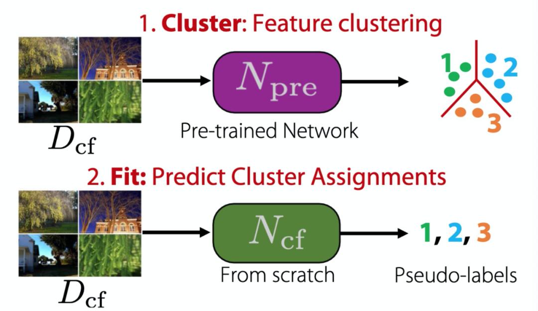 CF 主要包括两步骤的工作,第一步,Cluster,给定一个使用代理目标函数和新数据集进行训练的网络,利用学习到的特征空间对该数据集进行聚类。第二步,Fit,使用聚类作为伪标签在这个新数据集上从头开始训练一个新网络,见图 2。