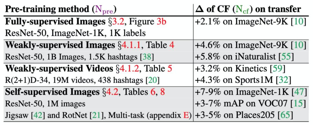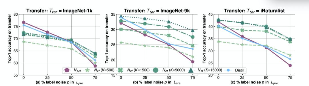 作者讨论了在受控设置下从「代理目标函数」训练学习到的特征的泛化程度。作者设置了这样一个实验场景:在 ImageNet-1K 数据库中,人为添加合成的标签噪声,目的是使得代理目标函数的预训练与下游的训练任务尽量不同。图 3 给出了不同的标签噪声 p 取值的 N_pre(即 CF 之前)和 N_cf(即 CF 之后)的迁移学习性能。在训练前存在大量的标签噪声的情况下,CF 仍然能够学习到可迁移的有效特性,对于更细粒度的目标任务,如 ImageNet-9K,CF 甚至可以改进有监督的 ResNet-50 模型(p=0)
