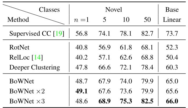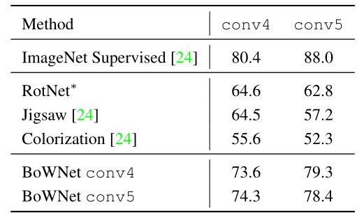 本文在 CIFAR-100、Mini-ImageNet、ImageNet、Places205、VOC07 分类和 V0C07+12 检测数据库中上评估了所提出的方法(BoWNet)。