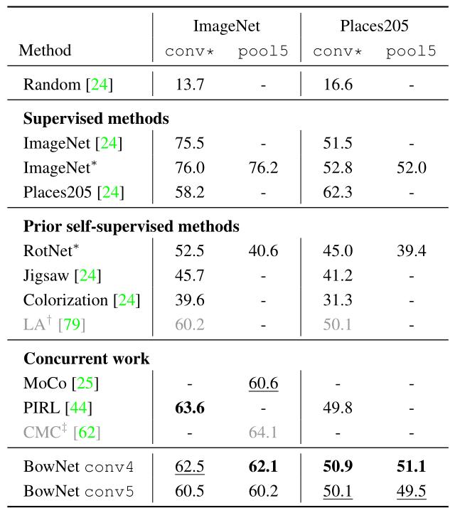 表 4. ImageNet 和 Places205 中线性分类准确度(使用 ResNet-50 结构)