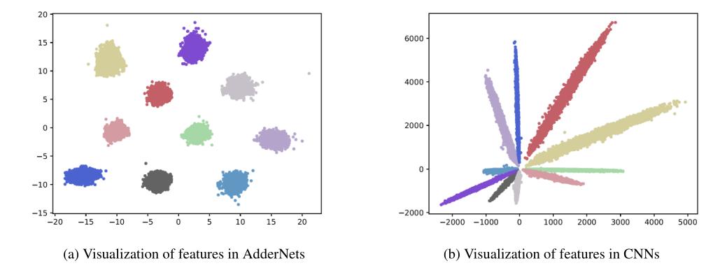 加法、减法、乘法和除法是数学中最基本的四种运算。众所周知,与加法相比,乘法计算复杂度高、计算速度慢。在深度神经网络中,度量输入特征与卷积滤波器的相似性是通过计算大量的浮点数相乘来实现的。在这篇文章中,作者提出了一种加法器网络(AdderNet),在放弃卷积运算的同时最大限度地利用加法,即,给定一系列小模板作为「神经网络中的滤波器」,使用 L1-norm 距离计算输入信号和模板之间的差异。图 1 中对比了经典 CNN 与本文提出的 AdderNet 提取特征的可视化展示。CNN 是通过角度来区分不同类别的特征,而使用 L1-norm 距离的 AdderNet 则是通过向不同类别的类中心聚集来区分别不同类别的特征。由于减法可以通过其补码通过加法实现,因此 L1-norm 距离可以是一种硬件友好的仅具有加法的度量,作者认为,它可以成为构造神经网络的卷积的有效替代方法。