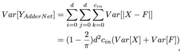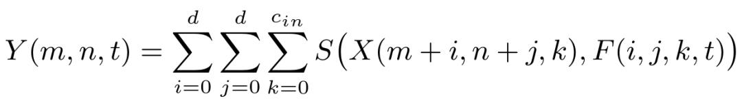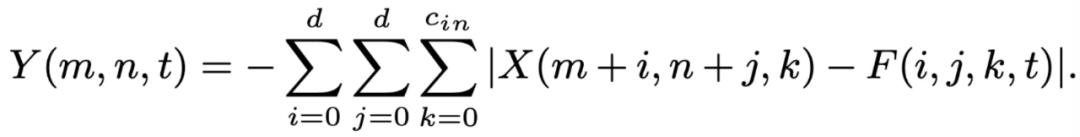 给定一个深度神经网络的中间层,考虑一个滤波器 F,其中核大小为 d,输入通道为 c_in,输出通道为 c_out。输入特征定义为 X,令 H 和 W 分别为特征的高度和宽度,输出特征 Y 表示滤波器和输入特征之间的相似性,得到公式:
