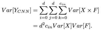 经典 CNN 中,假设权值和输入特征是独立的,并且在正态分布下分布一致,则输出方差可以粗略估计为: