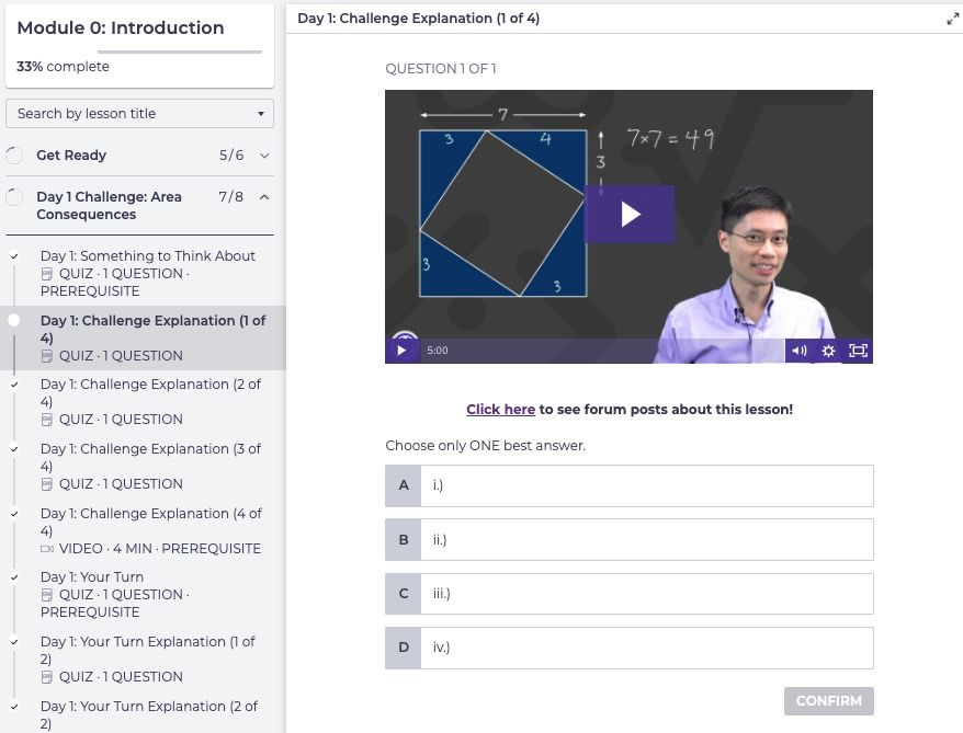 本系列课程采用答题闯关+录制视频课程讲解+线上练习的形式,一共有 12 门课程 (Module 0- Module 11), 每门课程原价 149 美金。每一门课有 16 天的“日挑战”和 4 次“周挑战”。“日挑战” 包括了两道罗教授设计的原创题目和讲解,学生应在观看讲解前尽力尝试解题,学习时间为30-40分钟;“周挑战” 则是限时 40 分钟的 20 道练习题目,答对一定数量题目方可继续课程。练习题是巩固和进一步学习、思考的机会,建议学生阅读所有精心撰写、用于教授更多知识的答案解析,练习巩固时间为1小时左右。