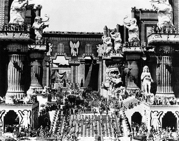 这是1916年大卫·格里菲斯执导的电影《党同伐异》里的一个镜头,可以说是默片时代最有名的静照之一,表现的是古巴比伦城门打开的场景。为拍摄这个场面,导演动用了无数资源:数以千计的演员,无比奢华的布景,取景范围非常广。电影史上另一个可以与之媲美的是1963年电影《埃及艳后》里的著名场景。做大场面很少有不亏本的,《党同伐异》赔了,《埃及艳后》也是一样。