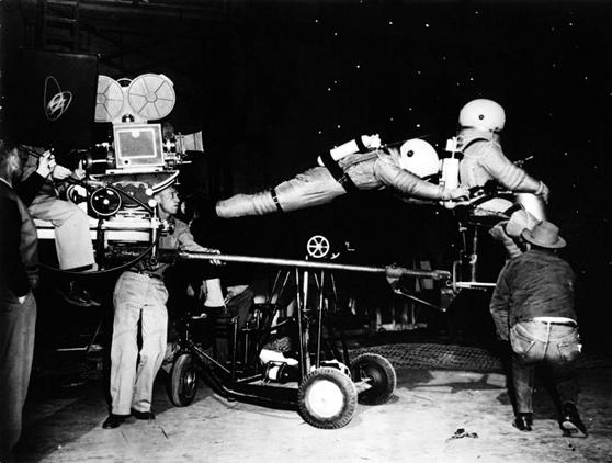 这张静照中间的演员,在借助吊着他的钢丝表演“太空漂浮”。这个电影场景里,两位宇航员已经在月球上了,而我们人类真正第一次登陆月球是什么时候呢?1969年。