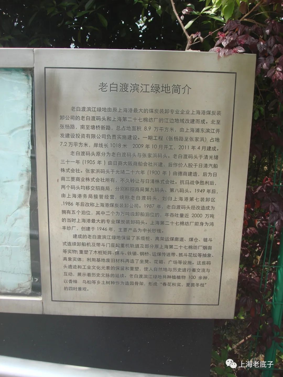 老白渡滨江绿地由原上海港最大的煤炭装卸专业企业上海港煤炭装卸公司的老白渡码头和上海第二十七棉纺厂的江边地域改建而成。北至张杨路,南至塘桥新路,岸线长1018米。老白渡码头原分为老白渡码头与张家浜码头。解放后,由上海港务局接管经营,统称老白渡码头。1987年,老白渡码头经改造成为拥有五个泊位,其中二个为万吨级卸船泊位的,年吞吐量近2000万吨的当时上海港最大的专业煤炭装卸码头。