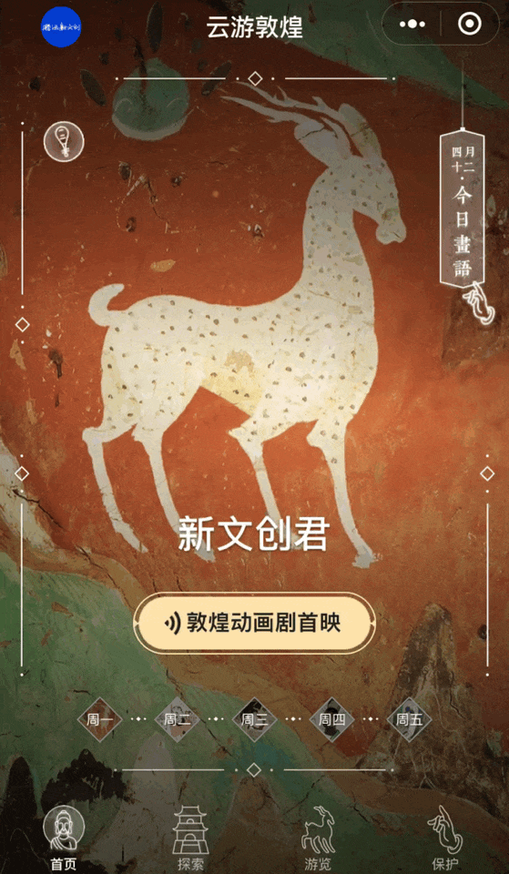 4月13日,以莫高窟经典壁画为原型,敦煌研究院携手腾讯旗下腾讯影业和腾讯动漫联合出品的“敦煌动画剧”在微信和QQ小程序“云游敦煌”上同步首映。用户不仅可以观看和分享该系列动画剧,还可以亲身参与动画剧的配音和互动。这是“云游敦煌”小程序上线一个月之后的重大版本升级,也是敦煌研究院与腾讯影业、腾讯动漫携手,通过“新文创”模式,为敦煌文化的数字内容创新做出的重要探索。