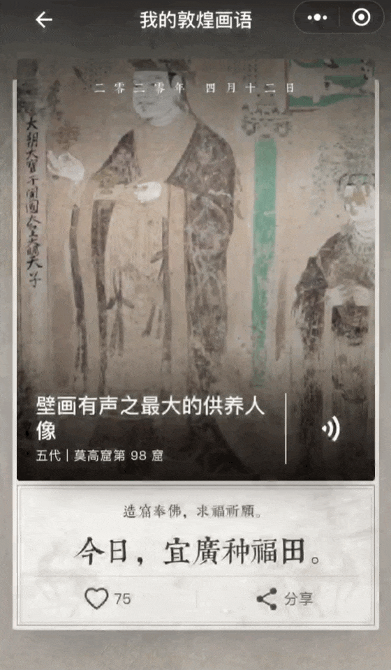 同时,小程序还推出了由敦煌研究院讲解员倾情解说的“敦煌石窟之最”有声系列内容,如最早的3D图案画、最早的AI演奏会等内容,将通过“今日画语”板块呈现,这是此前最受用户欢迎的功能板块之一。