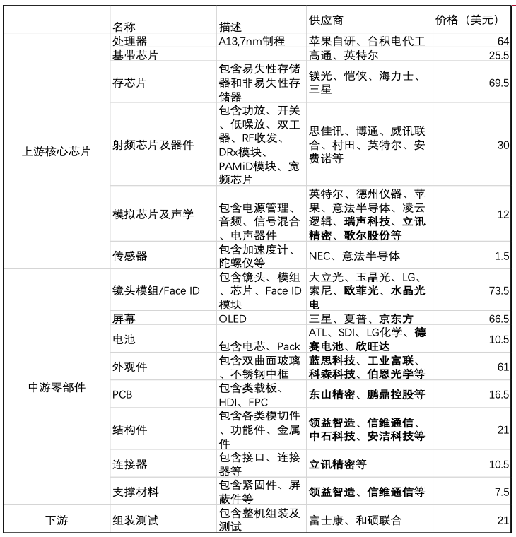 iPhone组成部分包括上游核心芯片、中游零部件、下游整机组装。从BOM成本清单中可以很明显地看出其成本大头主要是各类芯片和屏幕,其次是零部件,最低是整机组装。