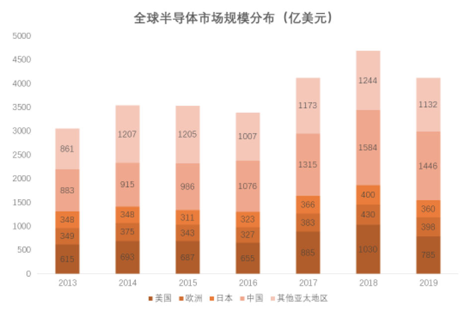 2019年全球半导体市场全年总销售额达4121亿美元,较2018年下滑12.1%。其中,美国半导体市场总销售额达785亿美元,同比下滑23.8%;中国大陆市场销售额达1446亿美元,同比下滑8.7%。