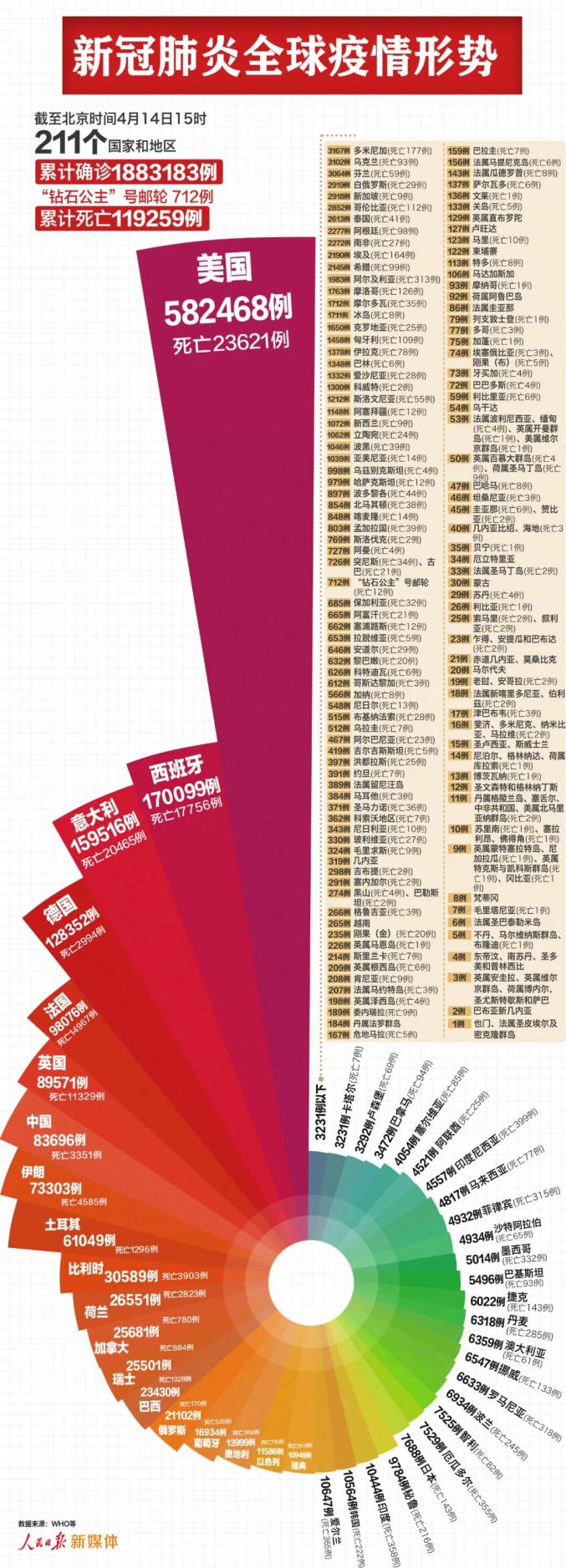 据美国约翰斯·霍普金斯大学实时统计数据,截至北京时间4月15日5时21分,全球新冠肺炎确诊病例达1961965例,死亡病例达125476例。