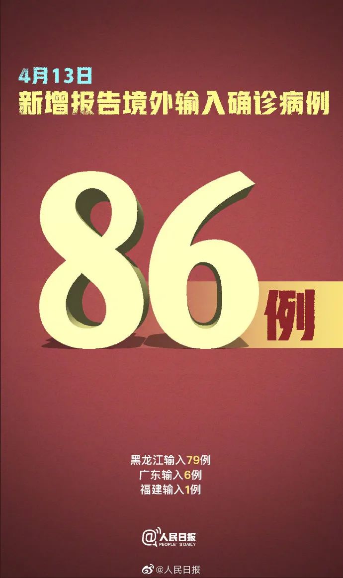 4月13日0—24时,新增86例境外输入病例。境外输入现有确诊病例905例(含重症病例37例),现有疑似病例72例。累计确诊病例1464例,累计治愈出院病例559例,无死亡病例。