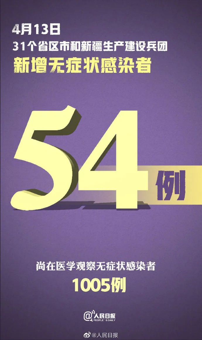 4月13日0—24时,31个省(自治区、直辖市)和新疆生产建设兵团报告新增无症状感染者54例,其中境外输入无症状感染者5例;当日转为确诊病例67例(境外输入66例);当日解除医学观察46例(境外输入9例);尚在医学观察无症状感染者1005例(境外输入237例)。