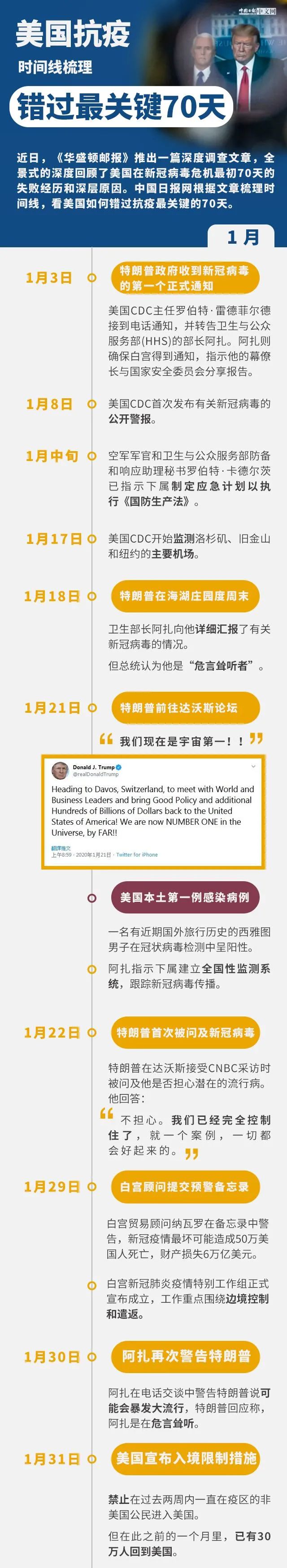 近日,《华盛顿邮报》推出一篇深度调查文章,全景式的深度回顾了美国在新冠病毒危机最初70天的失败经历和深层原因。中国日报网根据文章梳理时间线,看美国如何错过抗疫最关键的70天。