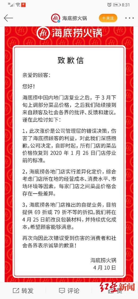 不过海底捞在恢复经营的第一时间却宣布涨价,结果由此上了热搜,并引发舆论强烈关注。好在海底捞很快又在4月10日发出致歉信,称涨价是公司管理层的错误决策,伤害了顾客的利益。自即时起,门店菜品价格恢复到今年1月26日门店停业前标准。