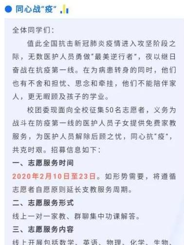 学校组成以青年党员、团员先锋为骨干的线上家教志愿服务队,义务为战斗在防疫第一线的医护人员子女提供免费家教服务,为医护人员解除后顾之忧。