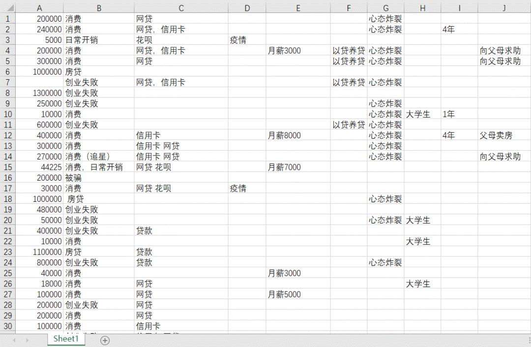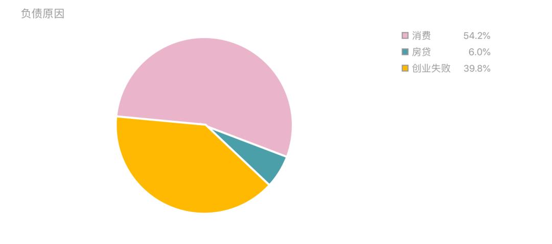 为了便于梳理分析,我把被骗、网赌等过于特殊的原因所致负债的个例,以及多种原因复合在一起的复杂个例剔除掉,大致把剩下的负债原因分成了三种:消费、创业(失败)、房贷。