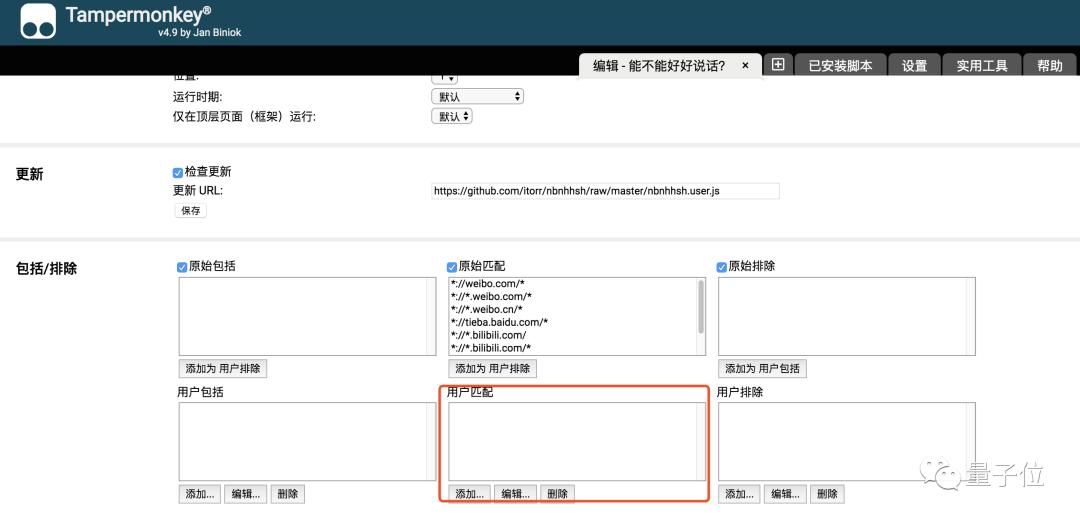 如果你想在更多的网页上使用这个脚本,可以在相应的脚本管理器配置中设置用户匹配,添加对应 URL 规则即可。以Chrome浏览器的Tampermonkey为例: