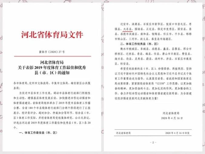 县委、县政府高度重视体育事业发展,立足三省结合部中等城市致力打造体育强县、冰雪运动强县。专门出台了《大名县全民健身公共服务体系三年攻坚实施方案》《大名县加快冰雪运动发展的实施方案》《大名县进一步强化“全国武术之乡”建设工作的实施方案》等一系列文件,高起点招商引智,投资2亿元建成了河北省篮球训练基地,引进北京体育大学合作建设省级武术职业学院,投资230万元建成拳击训练馆和摔跤训练房。全力构建全民健身公共服务体系,建设12处社会足球场地。同时立足资源共享,以明清古城为依托,建成了轮滑、篮球、体医健身、健身步道四大体育主题公园,打造主城区“10分钟健身圈”。助力脱贫攻坚投资200余万元布点农村体育设施,实现农村健身设施全覆盖。
