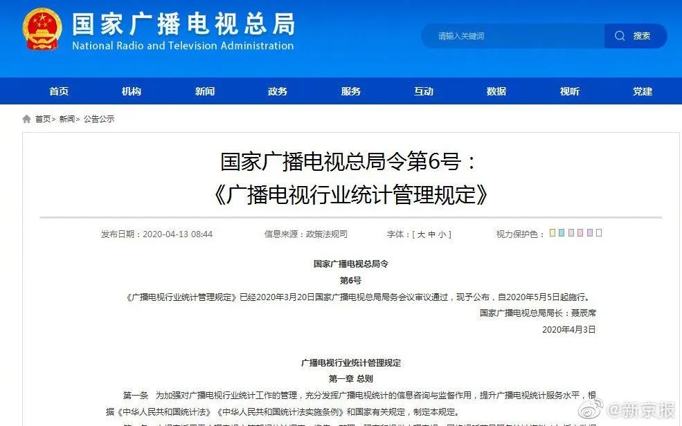 4月13日,国家广播电视总局发布了《广播电视行业统计管理规定》,针对广播电视行业统计活动,就机构人员设置、责任,统计调查制度,资料管理、公布以及监督等作出明确要求。