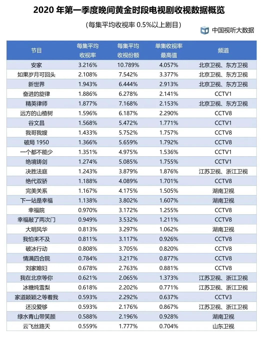 当然,CVB推行不到半年,一周发布一次,影响力还无法与CSM59城、酷云等数据系统相比。不过4月发布的2020第一季度收视数据,或可视为其出圈的第一步。