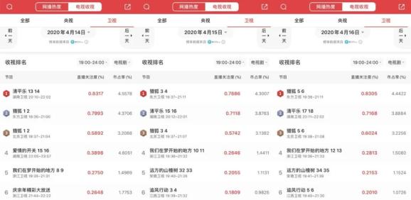 CVB最新的4月4日-10日黄金时段电视剧收视情况中显示,《清平乐》前七集的每集综合收视均值仅为0.519%。湖南卫视的卫视粉们又复发了“《天盛长歌》PTSD”,在贴吧里开始为剪辑与购剧出谋划策。在关于接档剧的讨论中,频频被提及的有虐恋改成扫黑除恶的《掌中之物》和郭靖宇团队打造的新版《小娘惹》。