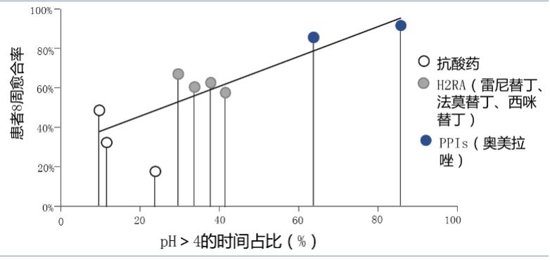 研究分析了传统抗酸药和包括PPI在内的抑酸药物的pH>4 HTR与患者8周黏膜愈合情况[12],发现RE黏膜愈合率与24h胃内pH>4 HTR呈正相关关系;同时研究者也总结出:PPIs抑酸作用显著强于抗酸药和H2RAs,24-h胃内pH>4 HTR可达16-18小时(Fig.3)。