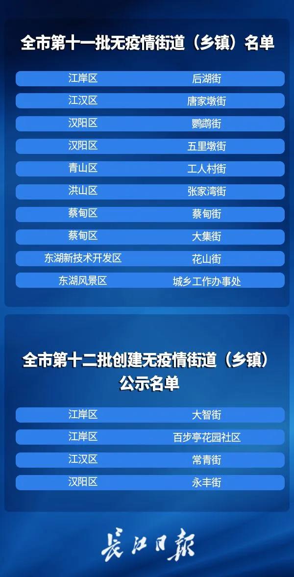 经各区疫情防控指挥部申报,并通过材料审查、数据比对、实地考核等环节严格评审,市疫情防控指挥部社区疫情防控组研究决定,命名江岸区后湖街等10个街道(乡镇)为全市第十一批无疫情街道(乡镇)。