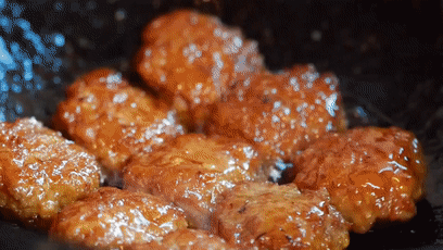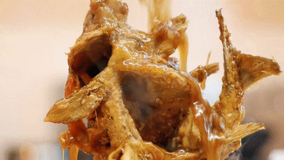 炸至金黄后捞出来,淋上用醋糖按比例调的浓汁,香气扑鼻,一道外焦内嫩、酸甜可口的糖醋鲤鱼大功告成。鱼头和鱼尾高高翘起,造型别致。